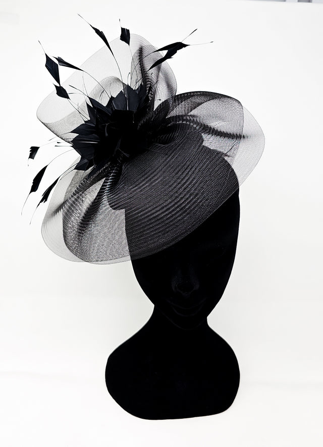 Pickup is available for Black Feather Fascinator With Net Halo at Unit 4, Jennymount Business Park, North Derby Street