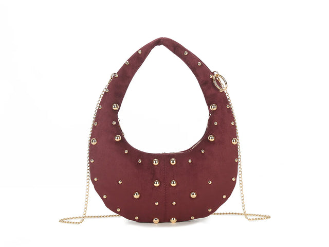 Burgundy & Gold Studded Half Moon Handbag is backordered and will ship as soon as it is back in stock.