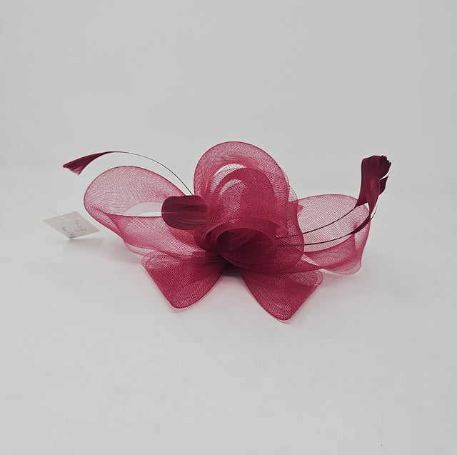 Burgundy toned fascinator set on slide with feather strands and loop detail.