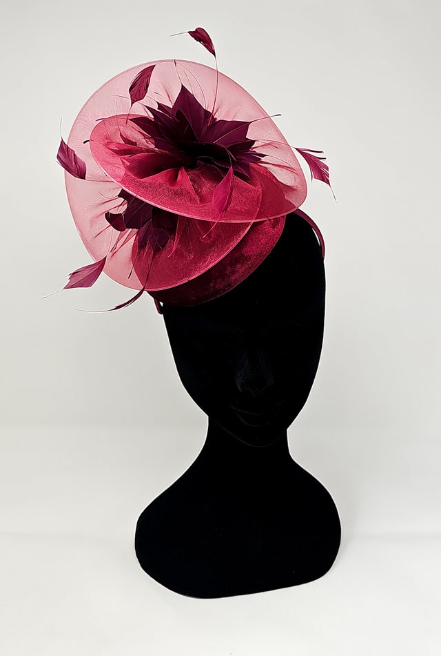 Beautiful & delicate , layered organza fascinator set on colour matching hairband with feathered flower centre design . Set on a velvet covered base.