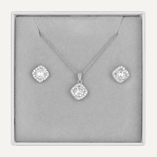 D&X Classic Silver Cushion Cut Halo Jewellery Set
