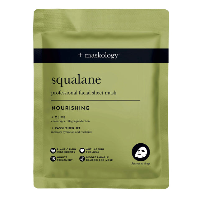 The +maskology SQUALANE Professional Sheet Mask intensely hydrates, enriches and replenishes the skin, resulting in a youthful and energised complexion. Harnessing the power of Olive, Passionfruit, Organic Sweet Orange Oil and Organic Almond Oil, this fruit mix creates an anti-ageing formula that rejuvenates and soothes the skin.