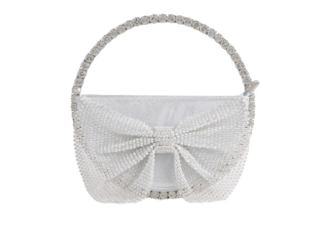 Add a sparkling touch to your special day with this Silver Diamante & Satin Shimmer Circle Bag. Adorned with dazzling crystals and a chic oversized bow, it’s the perfect playful companion for bridal or formal occasions. Stylish and eye-catching, it effortlessly combines glamour with a fun twist to complete your look.