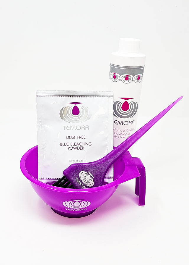 We have created a sample pack containing a 25g sachet of Temora Professional blue dust free powder bleach & a 250ml bottle Temora developer of your choice . Complete with a Temora branded tint bowl & application tint brush.