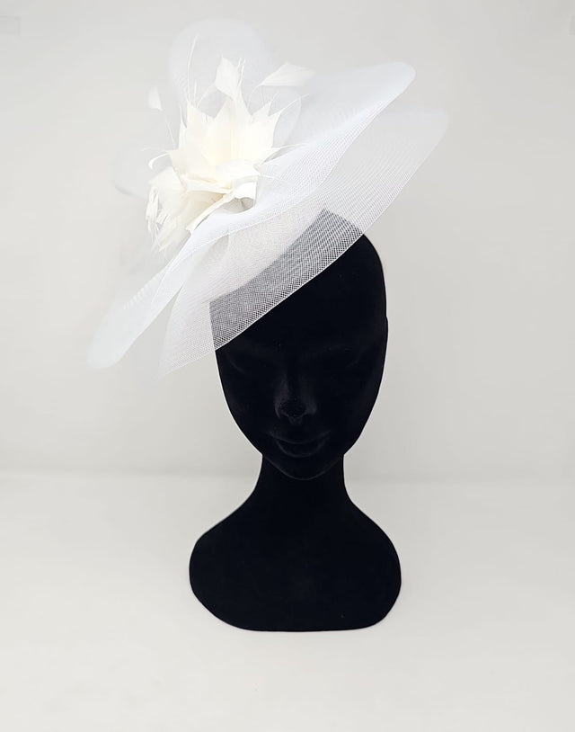Pickup is available for White Feather Fascinator With Net Halo at Unit 4, Jennymount Business Park, North Derby Street